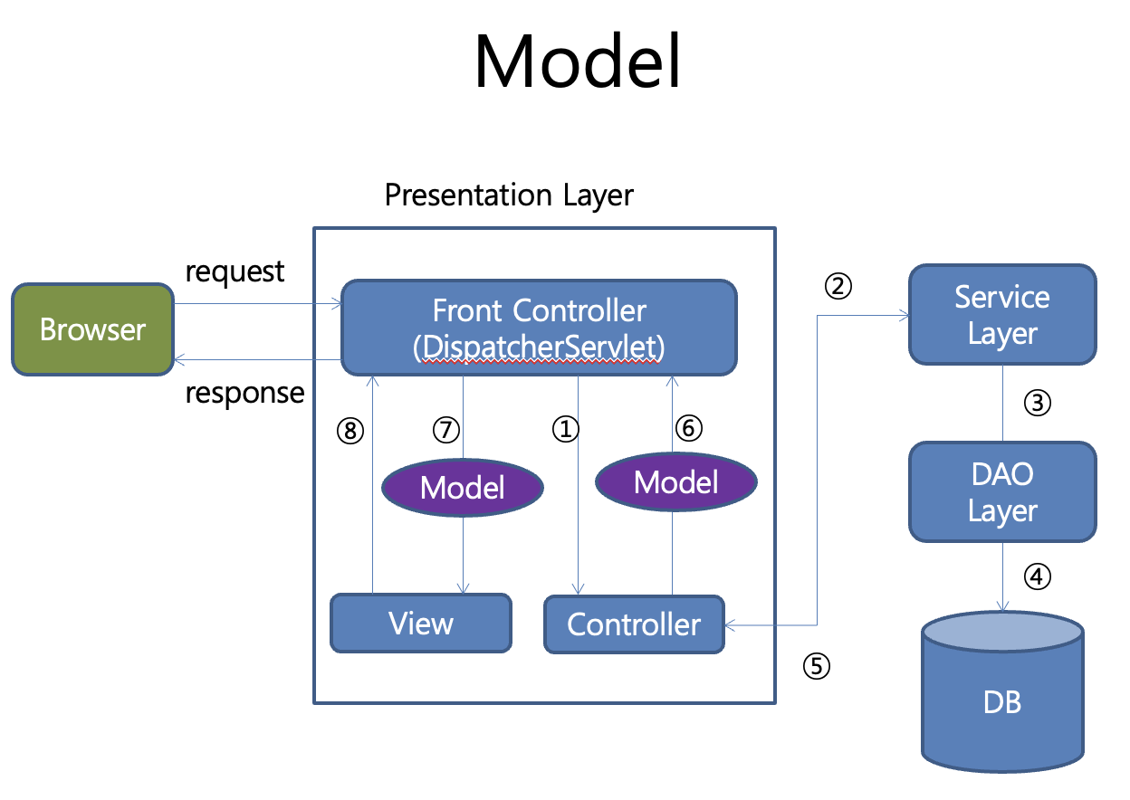 service -> DAO 호출 후, 그 결과를 Model에 저장하게 된다.
