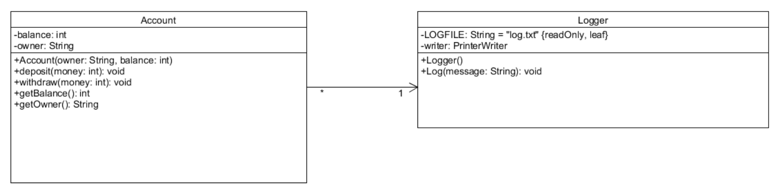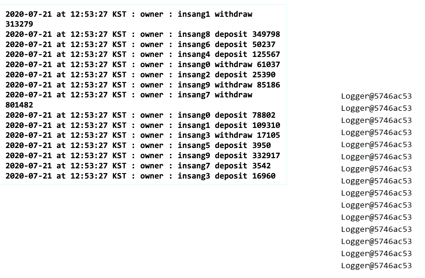 Account acct1 = new Account("insang1", 1000000); acct1.setMyLogger(logger);
