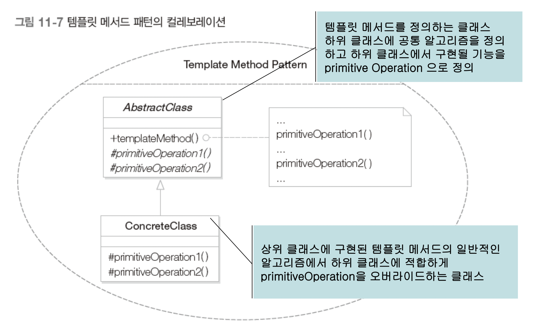 전체적인 알고리즘을 구현하면서 상이한 부분은 하위 클래스에서 구현할 수 있도록 해 주는 패턴
